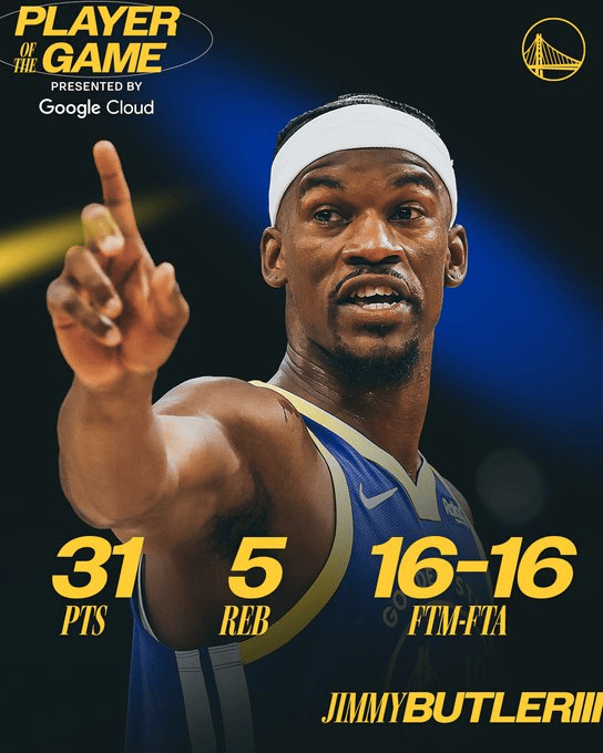 本場(chǎng)比賽,勇士球員吉米-巴特勒出戰(zhàn)34分鐘,14投7中,其中三分球2投1中,罰球16投16中,得到31分5籃板4助攻1搶斷。