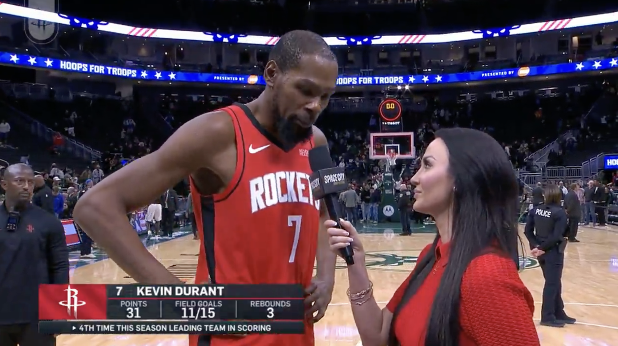 全場比賽,火箭球員凱文-杜蘭特首發(fā)出戰(zhàn)37分鐘,15投11中,三分球2投2中,罰球9罰7中得到31分3籃板7助攻。