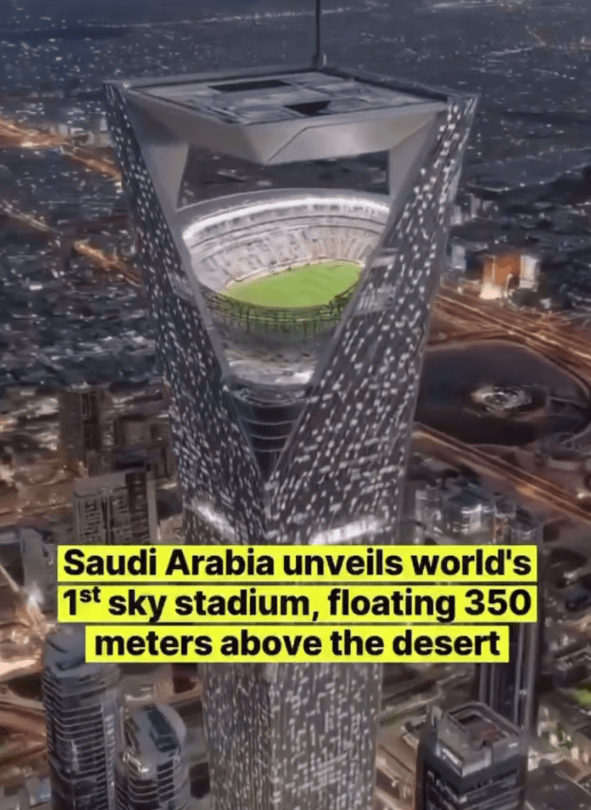 虎撲10月29日訊 沙特阿拉伯宣布建造全球首座“浮空體育場(chǎng)”,該建筑將懸浮于沙漠上方350米處,擬承計(jì)劃在2034年國(guó)際足聯(lián)世界杯期間承辦賽事。世界賽