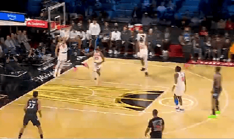 比賽的塔澤第一節(jié),貝恩卷切跑位,助攻滯空接比塔澤擊地助攻滯空拉桿上籃打進(jìn)。拉桿
