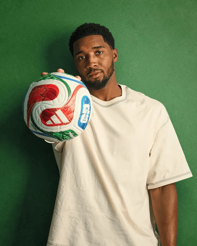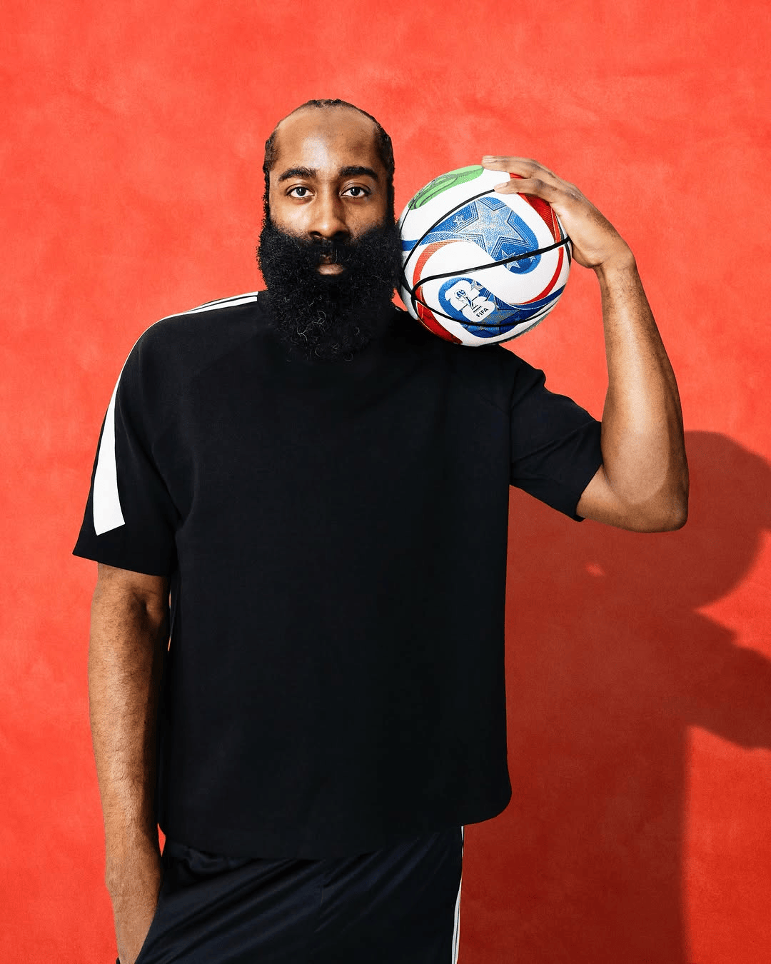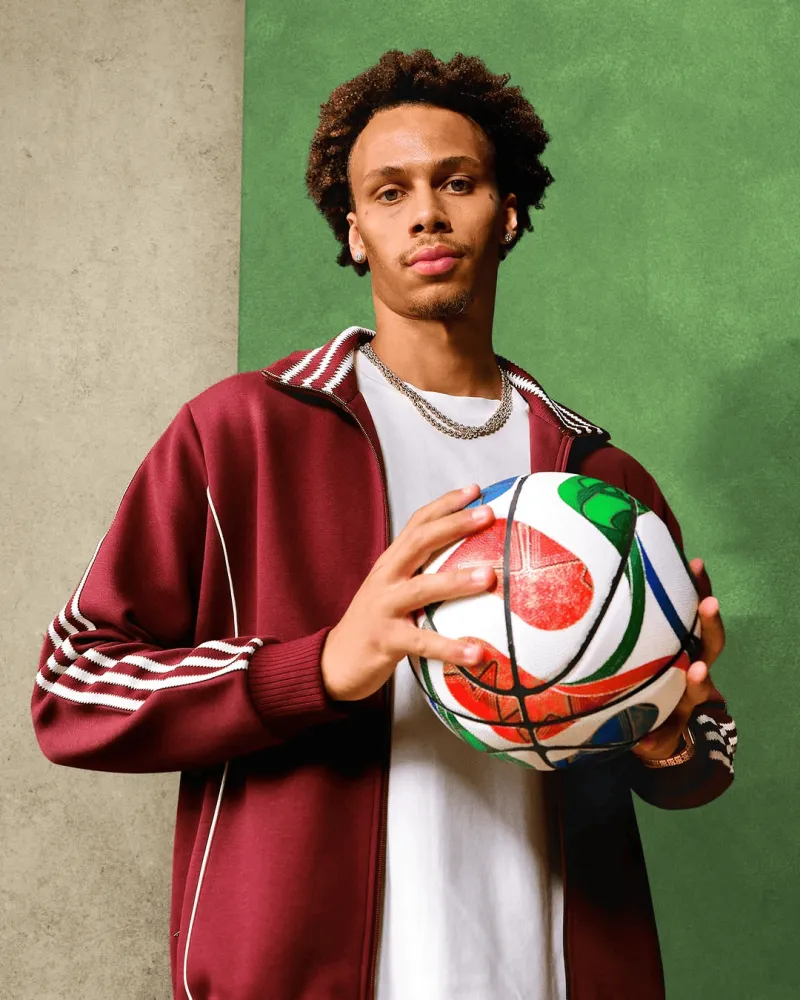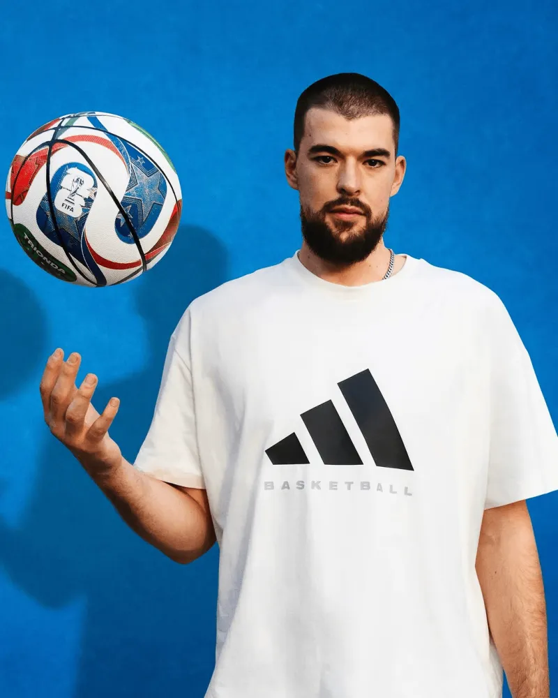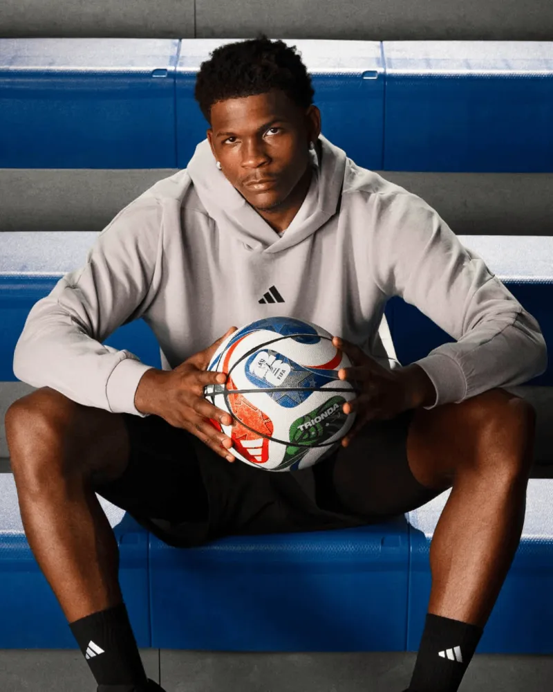 虎撲10月04日訊 adidas basketball更新官方社媒,展示品牌簽約的牌盛籃球運動員與2026FIFA美加墨世界杯官方比賽用球“Triodna”的合影。