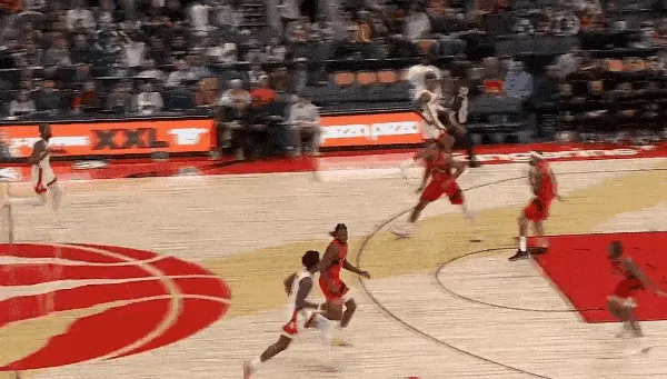 比賽的火箭第三節(jié),奧科吉,差拉小史密斯底角連中三分,奧科火箭將分差拉開到17分。吉小角連將分