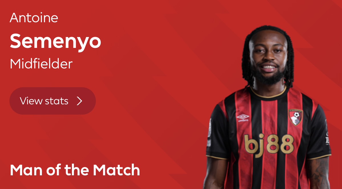 虎撲10月03日訊 英超第七輪,伯恩茅斯3-1富勒姆。梅約茅英超官方宣布本場貢獻(xiàn)2射1傳的當(dāng)選塞梅約當(dāng)選球迷票選全場最佳球員。