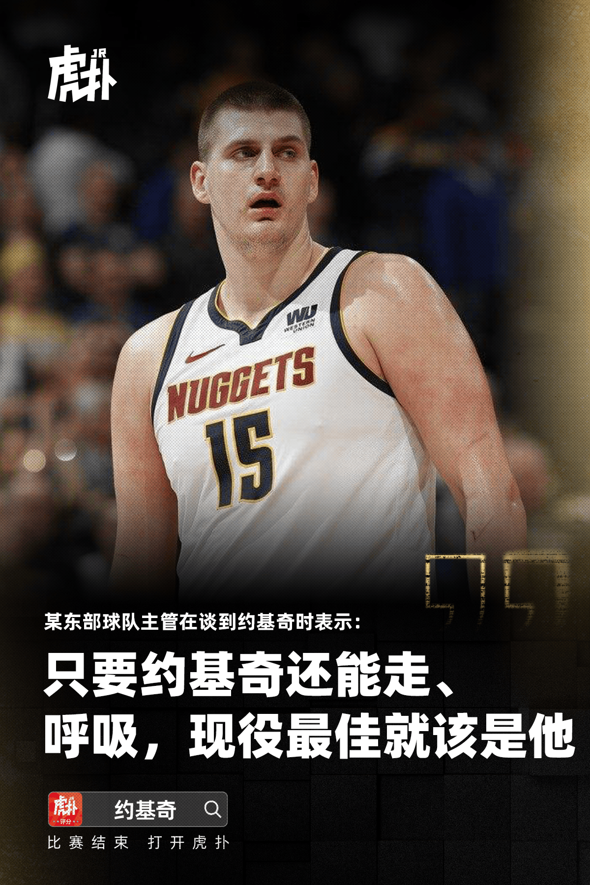 某東部球隊主管在談到約基奇時,板某表示:“只要他還能走,球隊還能呼吸,主管只約走呼現(xiàn)役最佳球員就該是基奇佳該他(As long as he’s walking and breathing, it should be him)!”