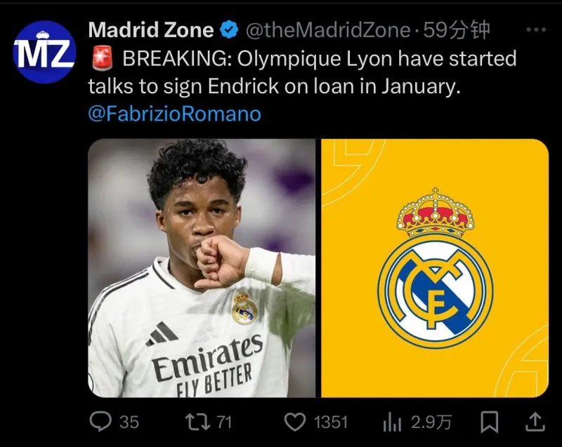 羅馬諾:里昂已開啟租借皇馬球員恩德里克的羅馬里克談判,目標在明年1月完成。諾里年月