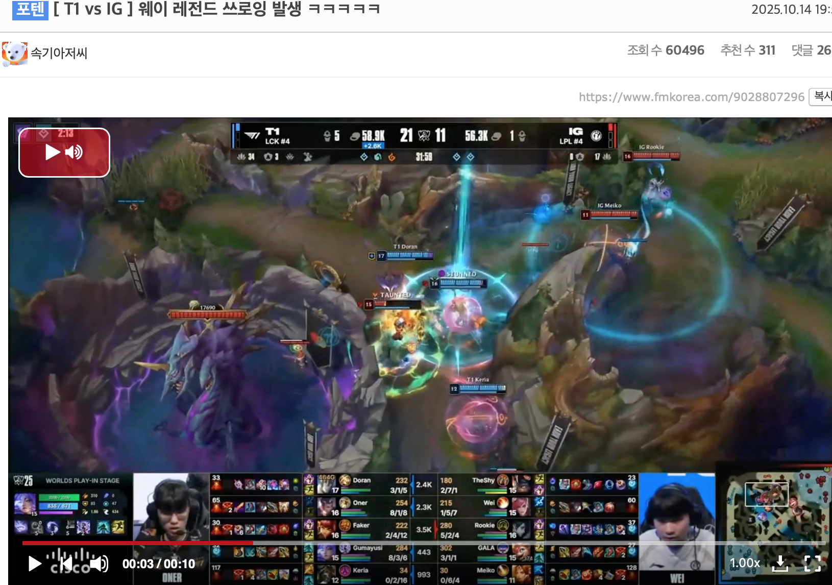 虎撲10月14日訊 2025英雄聯(lián)盟全球總決賽入圍賽iGvs T1第三局,T1率先拿到賽點(diǎn),站韓正韓國論壇FMKOREA網(wǎng)友對此展開熱議,網(wǎng)熱部分熱門評論翻譯如下: