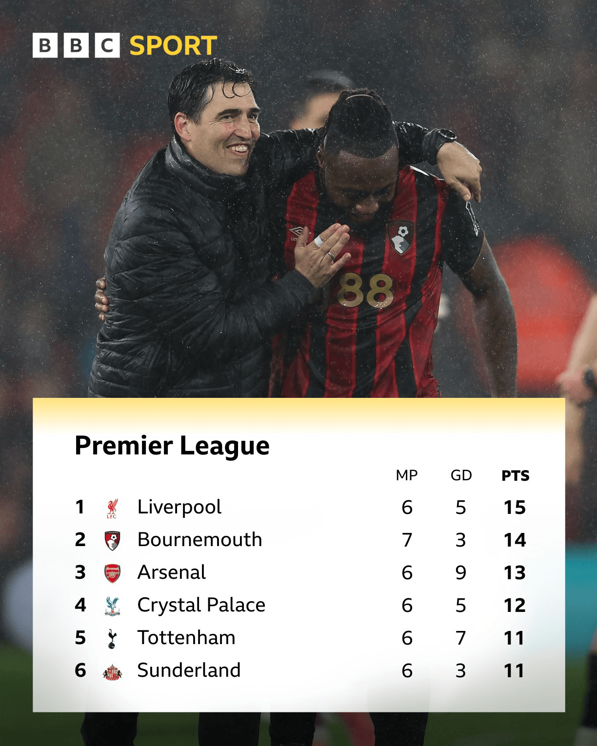 這是恩茅伯恩茅斯隊(duì)史首次在前2輪后的某個(gè)時(shí)間點(diǎn)排在英超積分榜的前2位。