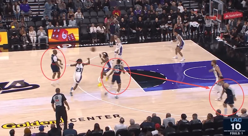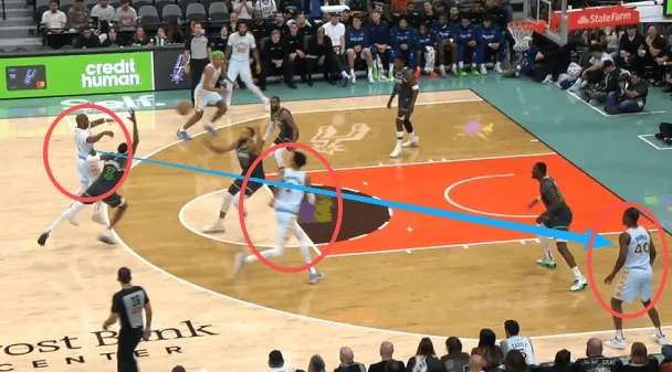 當(dāng)科林斯順下行進間,保羅、科林斯、大洛身位處于同一直線時,保羅立即傳球: