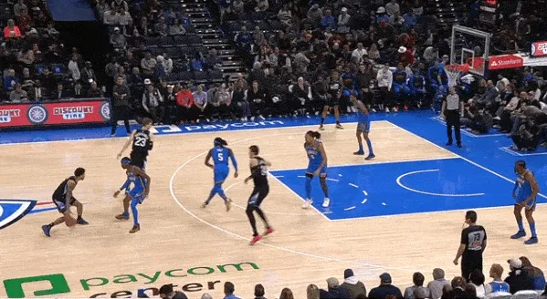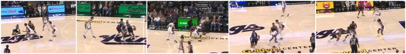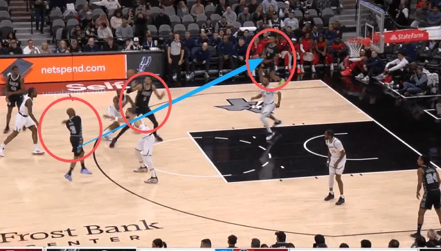 保羅大洛上線發(fā)起擋拆,小薩強延誤,弱側(cè)底角沙里奇回收墊防。在弱側(cè)底角科林斯啟動空切時保羅并沒有急著立即將球傳入他手中,而是抓住小薩歸位的“時間差”,看到科林斯伸手指天的動作后,立即將球給到。