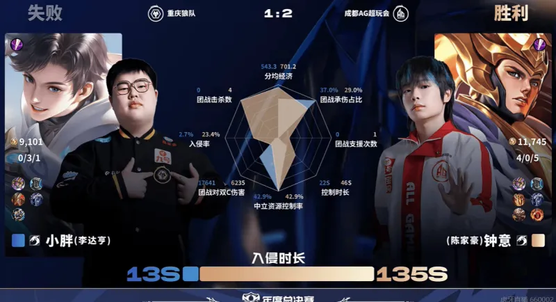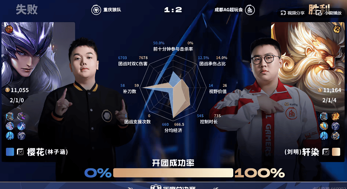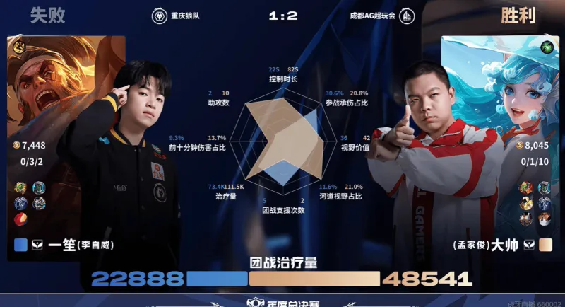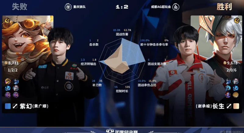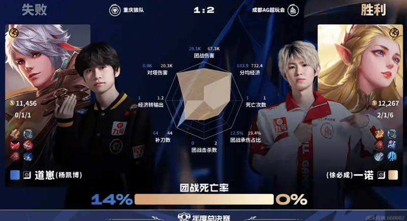 虎撲11月08日訊AG/狼隊(duì)第三局?jǐn)?shù)據(jù)圖:軒染開(kāi)團(tuán)成功率100%,一諾團(tuán)戰(zhàn)零死亡