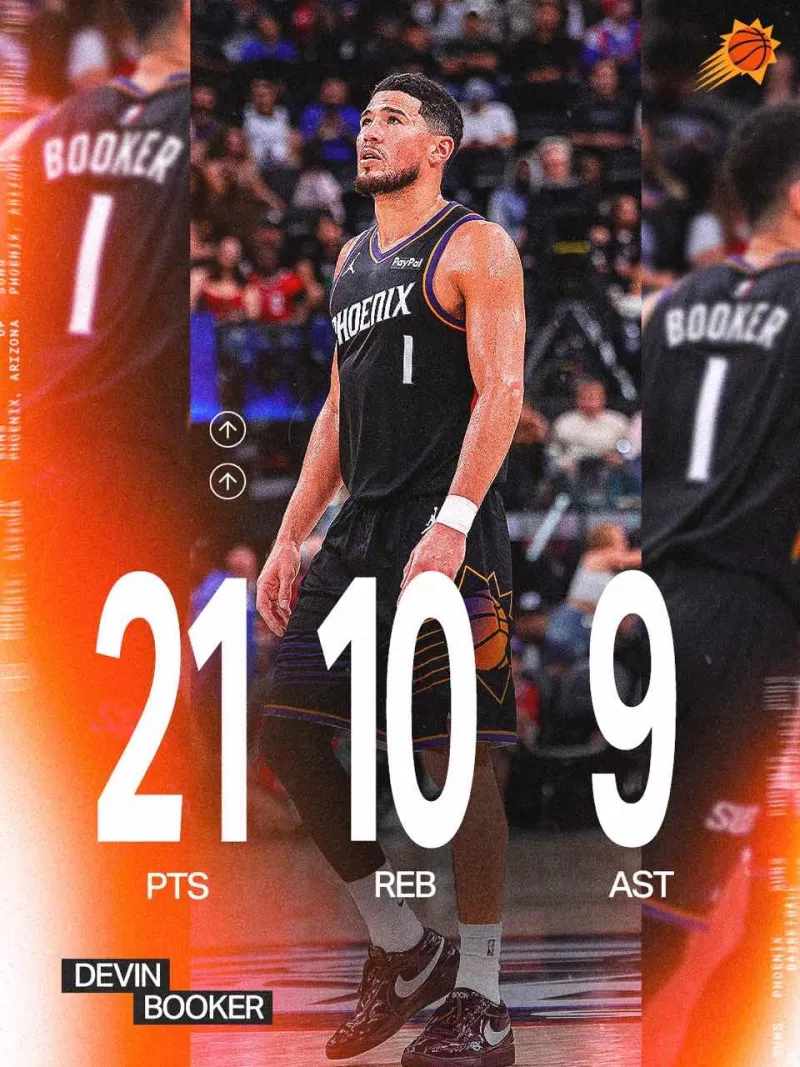本場比賽,據(jù)海太陽球員德文-布克出戰(zhàn)37分鐘,配文19投8中,其中三分球3投0中,罰球5投5中,得到21分10籃板9助攻。