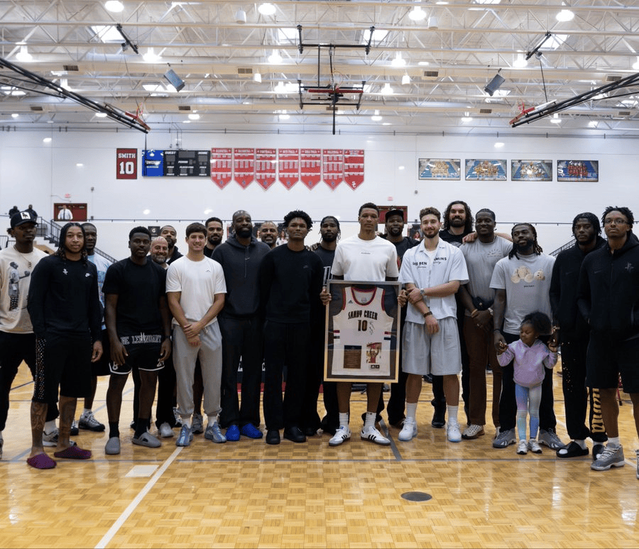 火箭全隊(duì)今日前往桑迪克里克高中體育館,傲祝參加小賈巴里-史密斯的賀史高中球衣退役儀式。