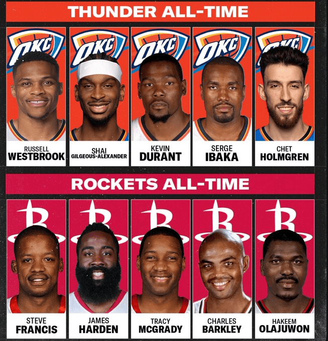 雷霆陣容為:威少、板美SGA、媒雷杜蘭特、霆隊伊巴卡、史最史最勝霍姆格倫。佳陣箭隊佳陣