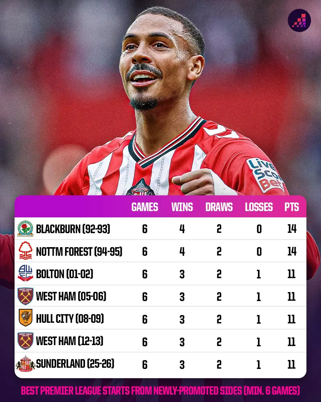 桑德蘭 (25/26賽季):6 場(chǎng),3 勝2平1負(fù),11分