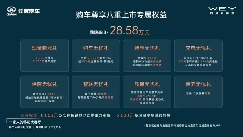 虎撲10月15日訊 魏牌官方宣布高山7迎來(lái)正式上市,新車(chē)售價(jià)28.58萬(wàn)元。同時(shí),官方推出現(xiàn)金膨脹禮、購(gòu)車(chē)無(wú)憂禮、智享無(wú)憂禮、充電無(wú)憂禮、保障無(wú)憂禮、智聯(lián)無(wú)憂禮、質(zhì)保無(wú)憂禮、保養(yǎng)無(wú)憂禮。新車(chē)定位為中大型MPV,采用家族設(shè)計(jì)語(yǔ)言,搭載Coffee Pilot Ultra智能輔助駕駛系統(tǒng)。