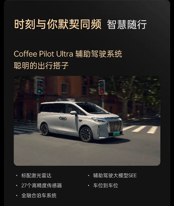 同時(shí),我們還看到車(chē)頂配備了激光雷達(dá),表示新車(chē)將搭載Coffee Pilot Ultra智能輔助駕駛系統(tǒng),支持高速和城市NOA以及智能泊車(chē)駕駛輔助功能。