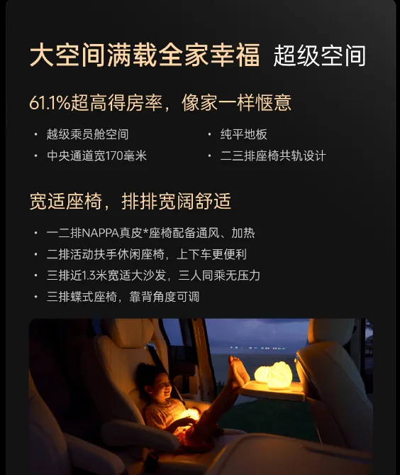 高山7座椅采用2+2+3的7座布局,第二排配備雙獨(dú)立座椅,支持電動(dòng)調(diào)節(jié)、通風(fēng)、加熱功能,并可選裝帶按摩功能的零重力座椅。此外,新車(chē)還為后排配備了吸頂娛樂(lè)屏、冷暖冰箱、折疊小桌板等配置。
