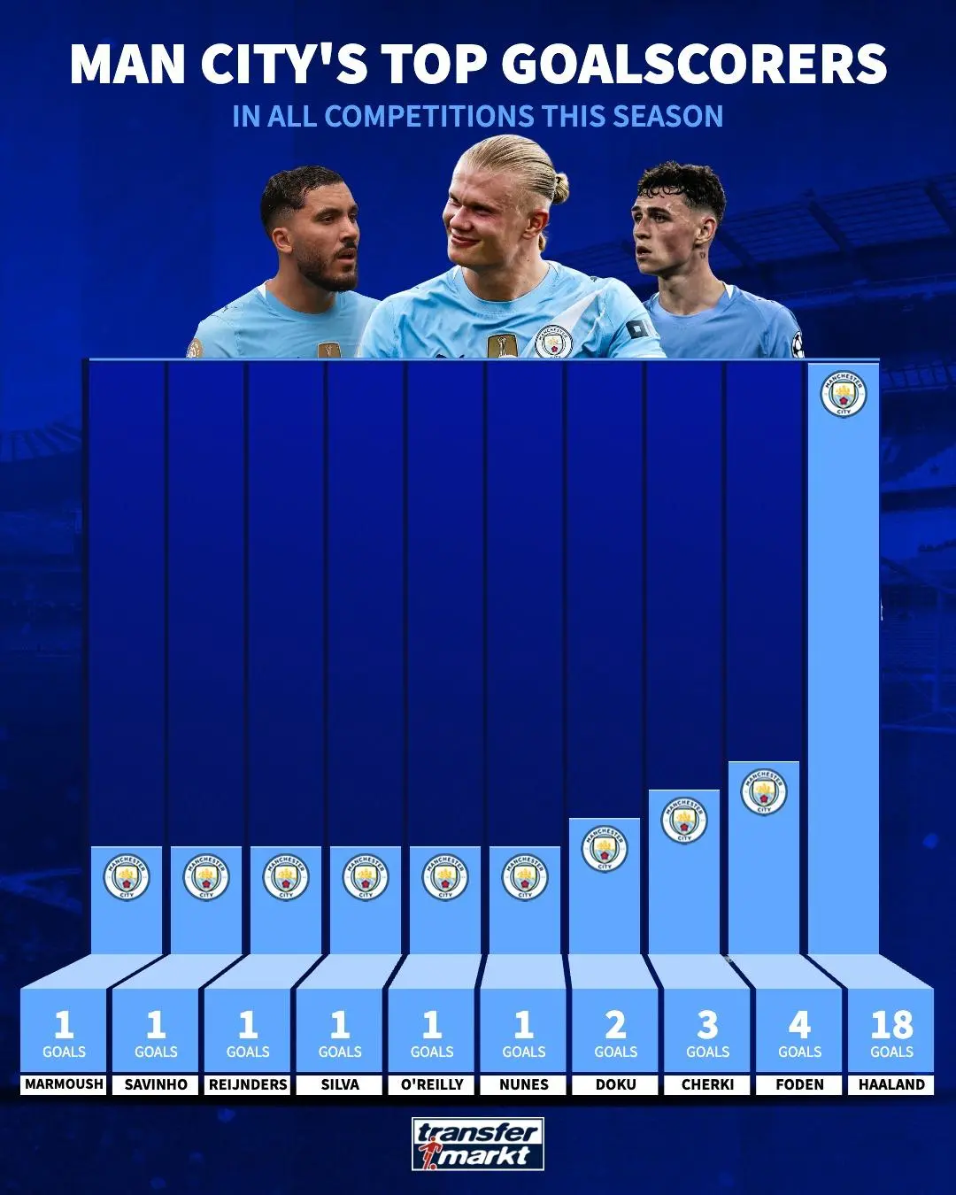 [流言板]哈蘭德本季代表曼城轟18球,多于曼城隊內(nèi)其他球員進球總和
