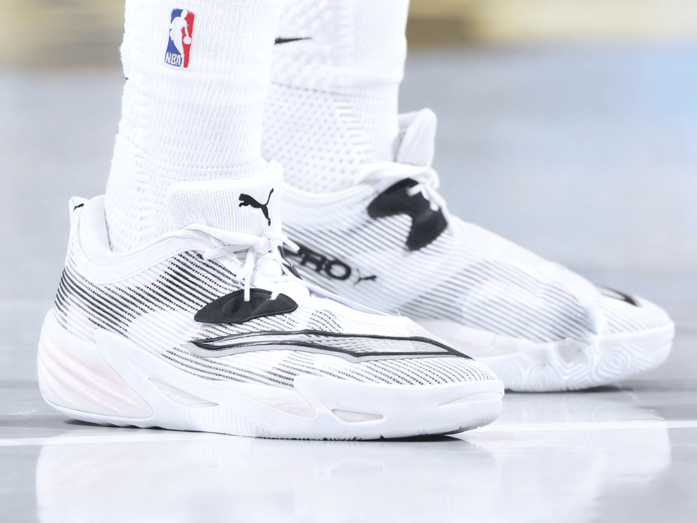 比賽中,特穿斯馬特上腳Puma All-Pro Nitro 2。板攻