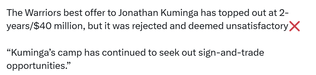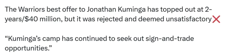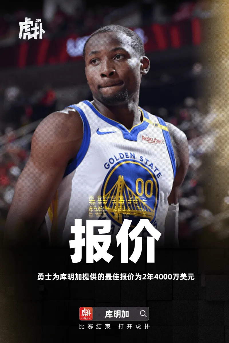 虎撲07月30日訊 今日,據(jù)美記Marc Stein報道,為庫勇士為喬納森-庫明加提供的明加美元最佳報價為2年4000萬美元,但這一報價已經(jīng)被拒絕,提供且被認(rèn)為無法令人滿意。佳報