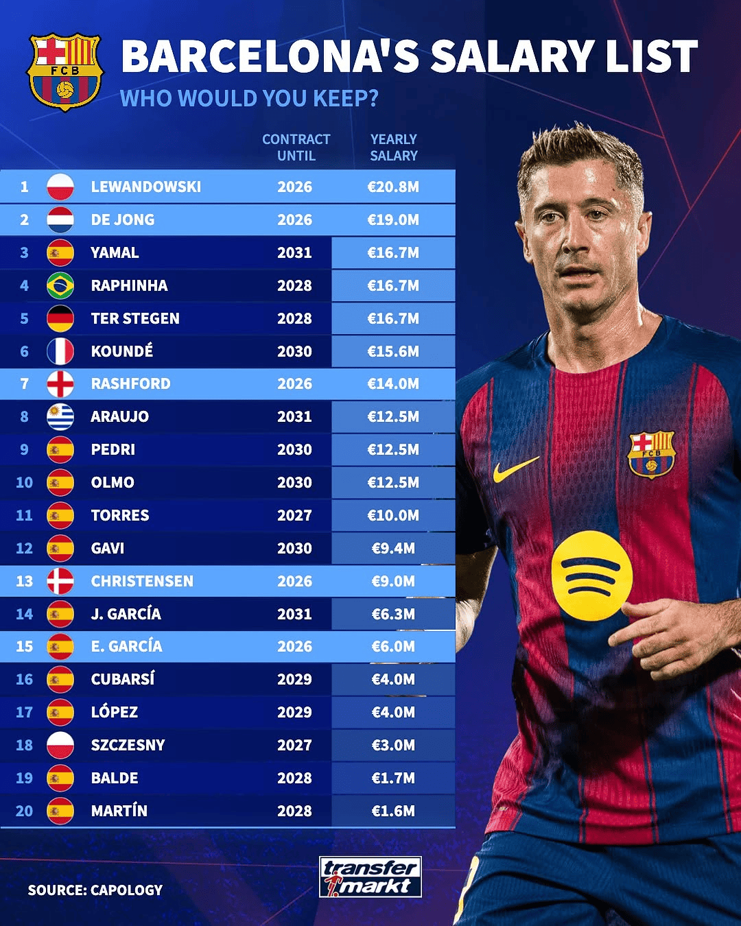 虎撲10月10日訊 德轉(zhuǎn)網(wǎng)站盤點(diǎn)了巴薩一線隊(duì)球員年薪排行,萊萬2080萬居首,薪榜德容亞馬爾分列二三,容亞人超千萬年薪球員有10位。千萬
