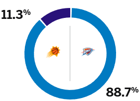賽前,日比美媒ESPN預(yù)測本場比賽,賽勝雷霆?jiǎng)俾蕿?8.7%,霆高太陽太陽勝率為11.3%。