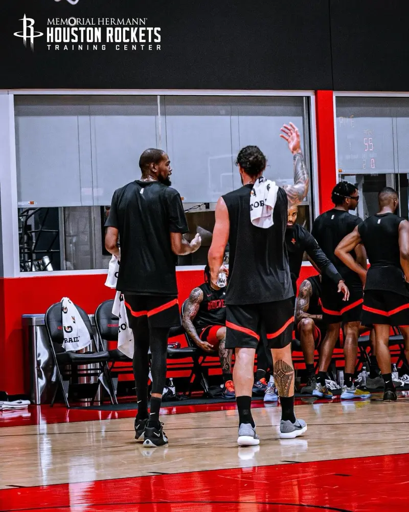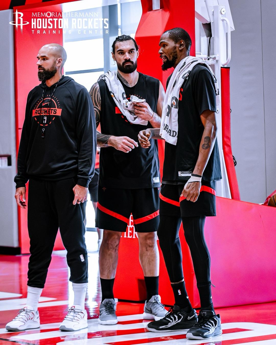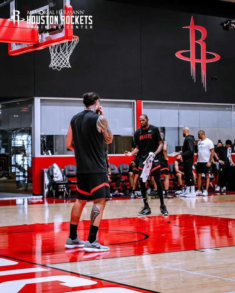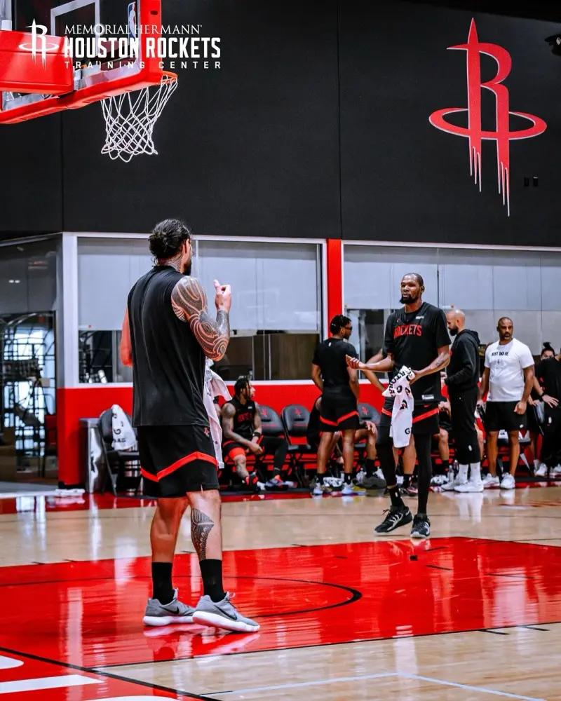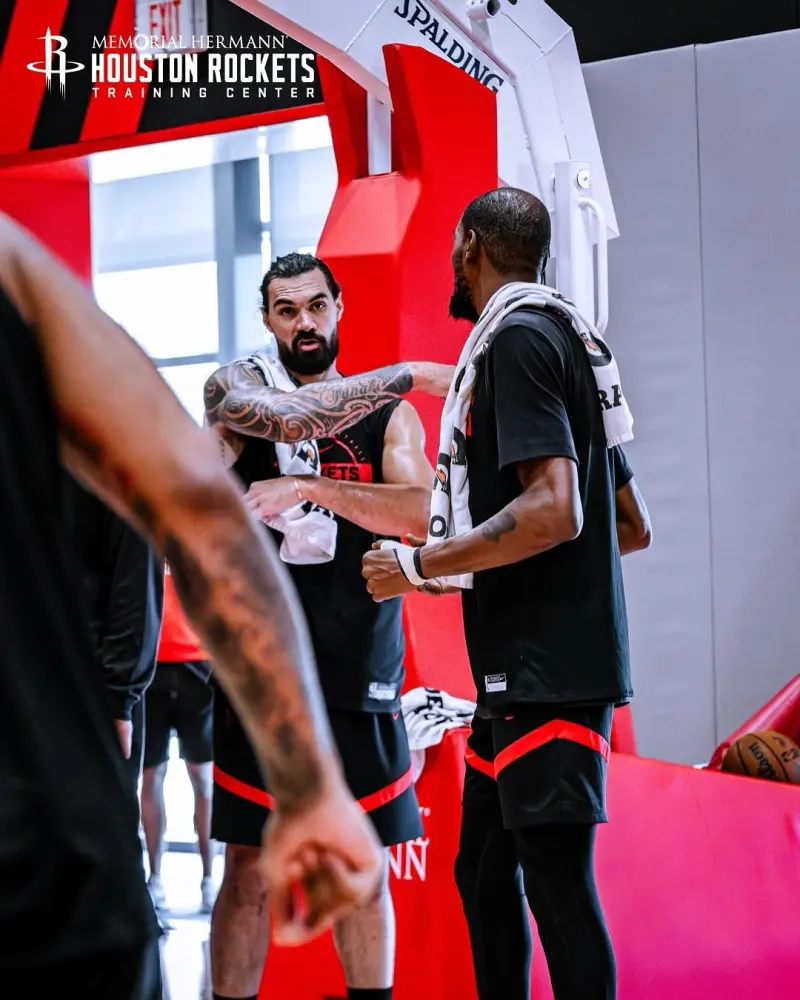 配文:熟悉的組合正逐化學(xué)反應(yīng)??新團隊。KD與史蒂文正在逐步磨合。火箭合中
