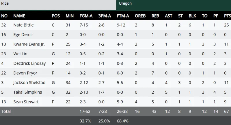 虎撲11月08日訊 NCAA常規(guī)賽,俄勒岡大學(xué)67-63戰(zhàn)勝萊斯大學(xué)。規(guī)賽