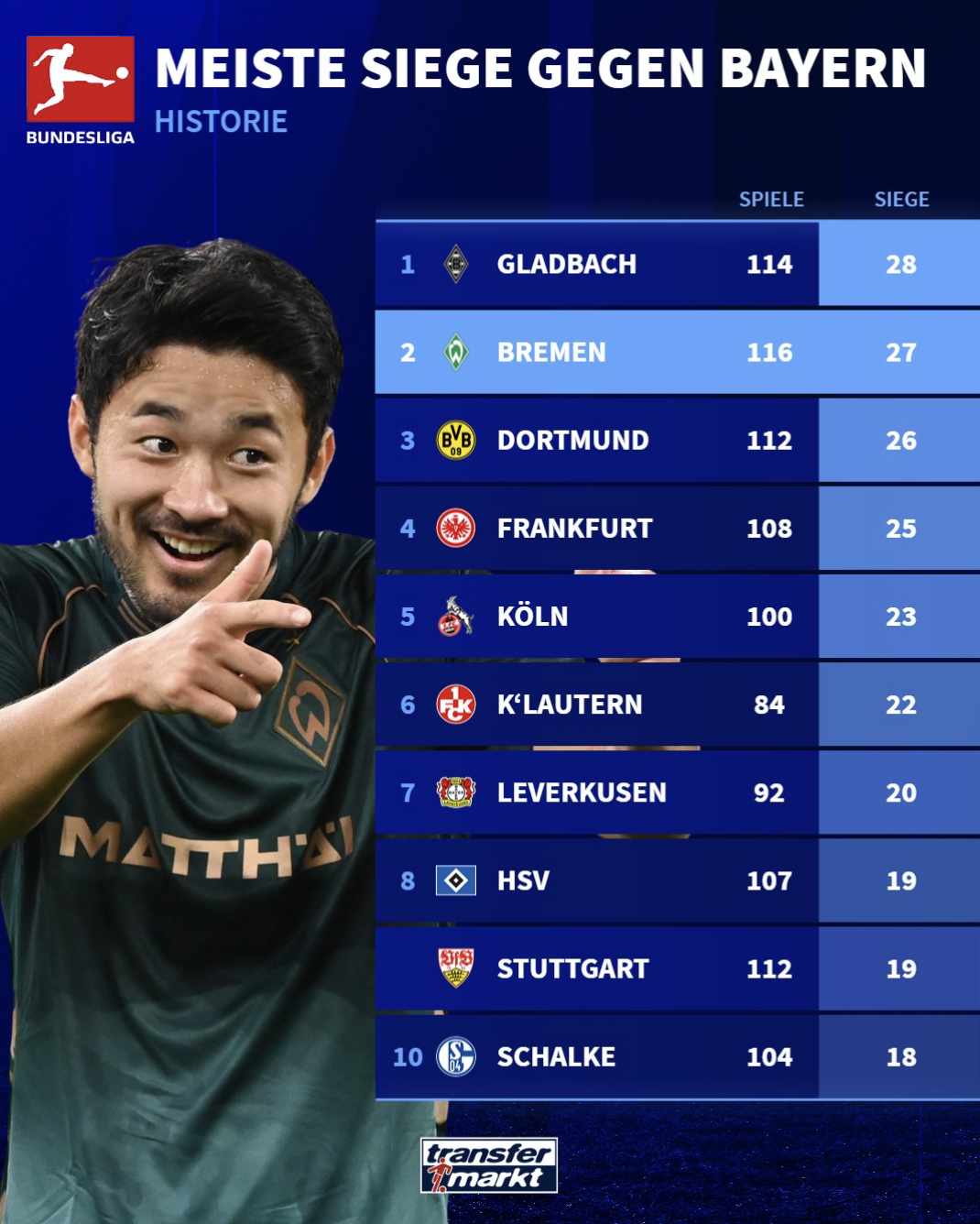 虎撲09月25日訊 德轉(zhuǎn)統(tǒng)計(jì)了德甲歷史上戰(zhàn)勝拜仁次數(shù)最多的球隊(duì)榜單。