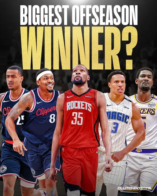 該媒體配圖中包括:約翰-科林斯(加盟快船)、布拉德利-比爾(加盟快船)、凱文-杜蘭特(加盟火箭)、德斯蒙德-貝恩(加盟魔術(shù))、德安德烈-艾頓(加盟湖人)。