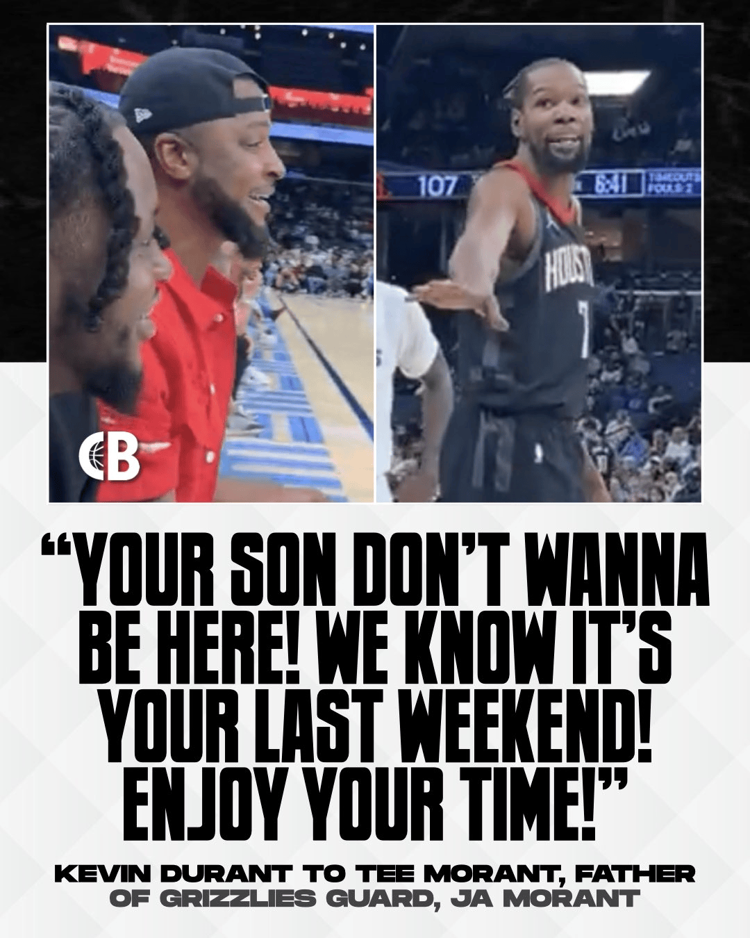 杜蘭特:“你兒子不想待在這里了,我們知道這是最后你在(灰熊主場看球的)最后一個(gè)周末!好好享受吧!個(gè)周”