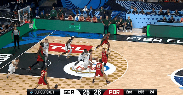 虎撲09月06日訊 男籃歐錦賽淘汰賽,德國(guó)對(duì)陣葡萄牙的演炸比賽正在進(jìn)行中。