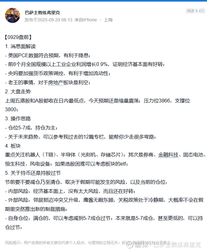 上周五的復(fù)盤里說過,機(jī)構(gòu)是沒有節(jié)前清倉的硬性需求的,除非國慶假期有什么固收產(chǎn)品能讓他們精準(zhǔn)吃到8天的收益,并且還能抵消進(jìn)場和離場的潛在損失;我看了一圈,是沒有看到這樣的產(chǎn)品的,網(wǎng)上說的那種,機(jī)構(gòu)節(jié)前清倉去買美股更是無稽之談;