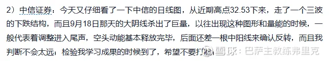 2)中信證券:今天允許你轉(zhuǎn)回原籍;9月25日那天,我說會有一根中陽線,而且不會太遠(yuǎn);老粉還記得上次我對一個(gè)標(biāo)的,給出中陽線的判斷是什么時(shí)候嗎?沒錯(cuò)是7月底建倉的每日互動(dòng);我很少很少給出中陽線的判斷,除非真的很有把握最近幾個(gè)交易日一定會出現(xiàn);今天中信這根陽線算是徹底宣告反轉(zhuǎn);它的日線今天走出金叉了,問題是等到金叉出現(xiàn)再去買不就晚了么?從技術(shù)結(jié)構(gòu)上來說,之前三波下跌結(jié)構(gòu)的末尾買入,事后來看沒有任何問題,不可能精準(zhǔn)買在最低點(diǎn);