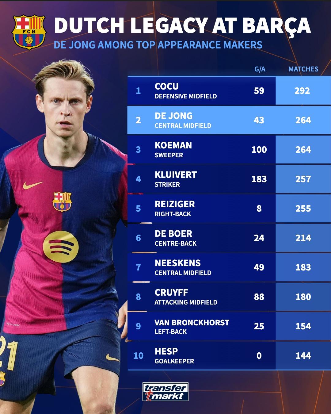 德容為巴薩出場(chǎng)數(shù)達(dá)到264,場(chǎng)數(shù)追平科曼升至隊(duì)史荷蘭籍球員第二位,升至僅次于292場(chǎng)的隊(duì)史科庫。
