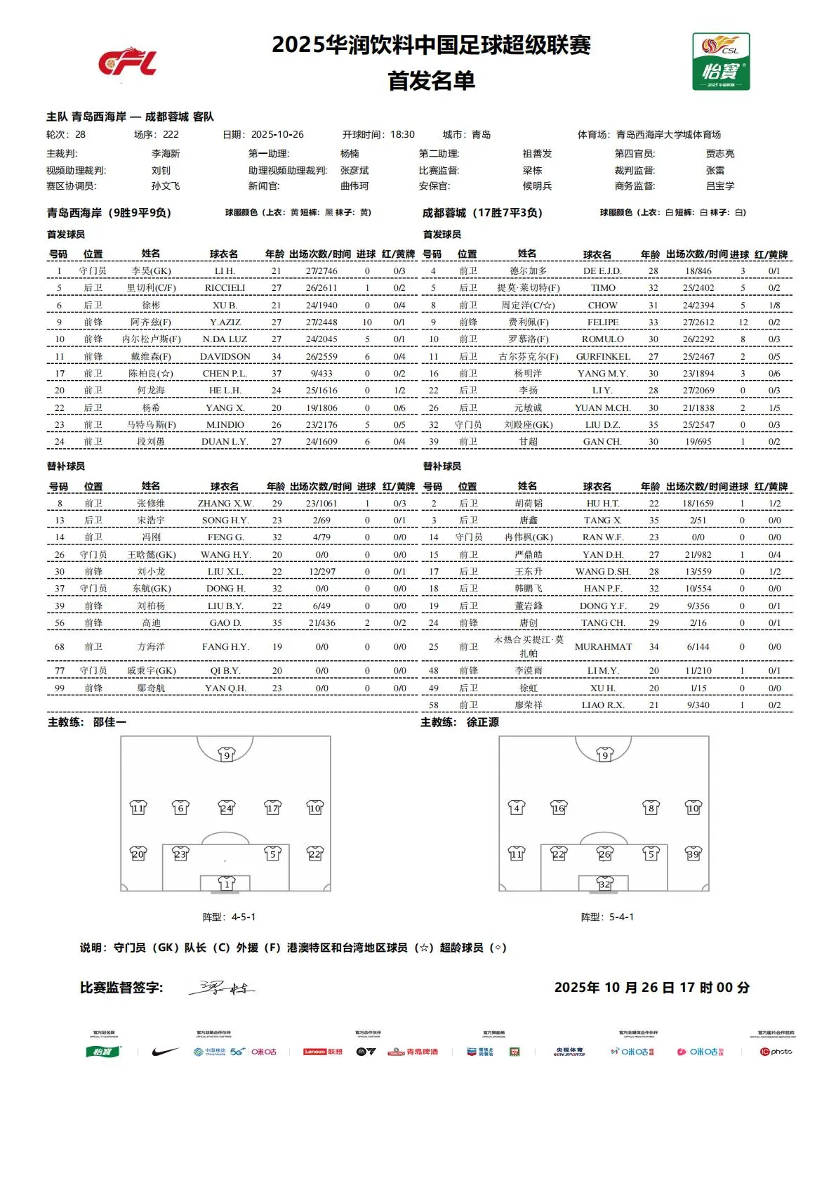 虎撲10月26日訊 北京時(shí)間今天18:30,青島西海岸將在主場(chǎng)迎戰(zhàn)成都蓉城,賽前雙方公布首發(fā)名單。