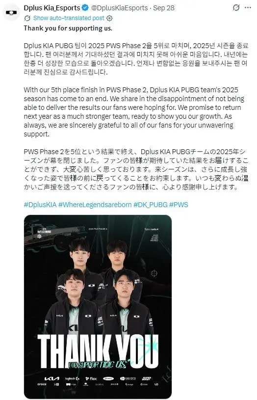 ④DK戰(zhàn)隊(duì)因成績(jī)不佳,官推第一時(shí)間用韓英日三語(yǔ)向粉絲們道歉,并承諾明年會(huì)以更強(qiáng)的姿態(tài)回來(lái)!