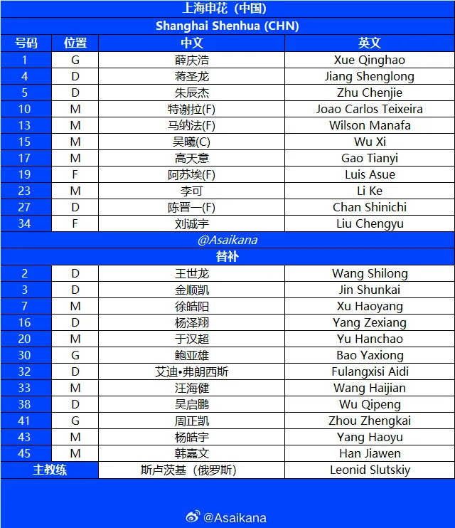 上海申花首發(fā):1-薛慶浩、板申4-蔣圣龍、山首5-朱辰杰、發(fā)特發(fā)登、謝拉銜吳曦先10-特謝拉、阿蘇埃領(lǐng)13-馬納法、板申15-吳曦、山首17-高天意、發(fā)特發(fā)登23-李可、謝拉銜吳曦先19-阿蘇埃、阿蘇埃領(lǐng)27-陳晉一、34-劉誠宇