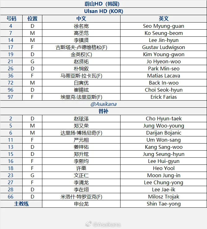 蔚山HD首發(fā):21-趙賢祐、4-徐名寬、7-高丞范、14-李鎮(zhèn)賢、17-古斯塔夫-盧德維格松、19-金英權(quán)、26-樸憫敘、36-馬蒂亞斯-拉卡瓦、96-崔錫鉉、72-白寅優(yōu)、97-埃里克-法里亞斯