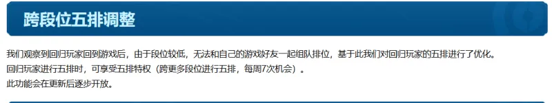 為了玩家回歸,策劃也是操了不少的心,新賽季的跨段五排,如果是回歸玩家,可以跨更多的段位進(jìn)行五排,當(dāng)然了,每周限制7次。