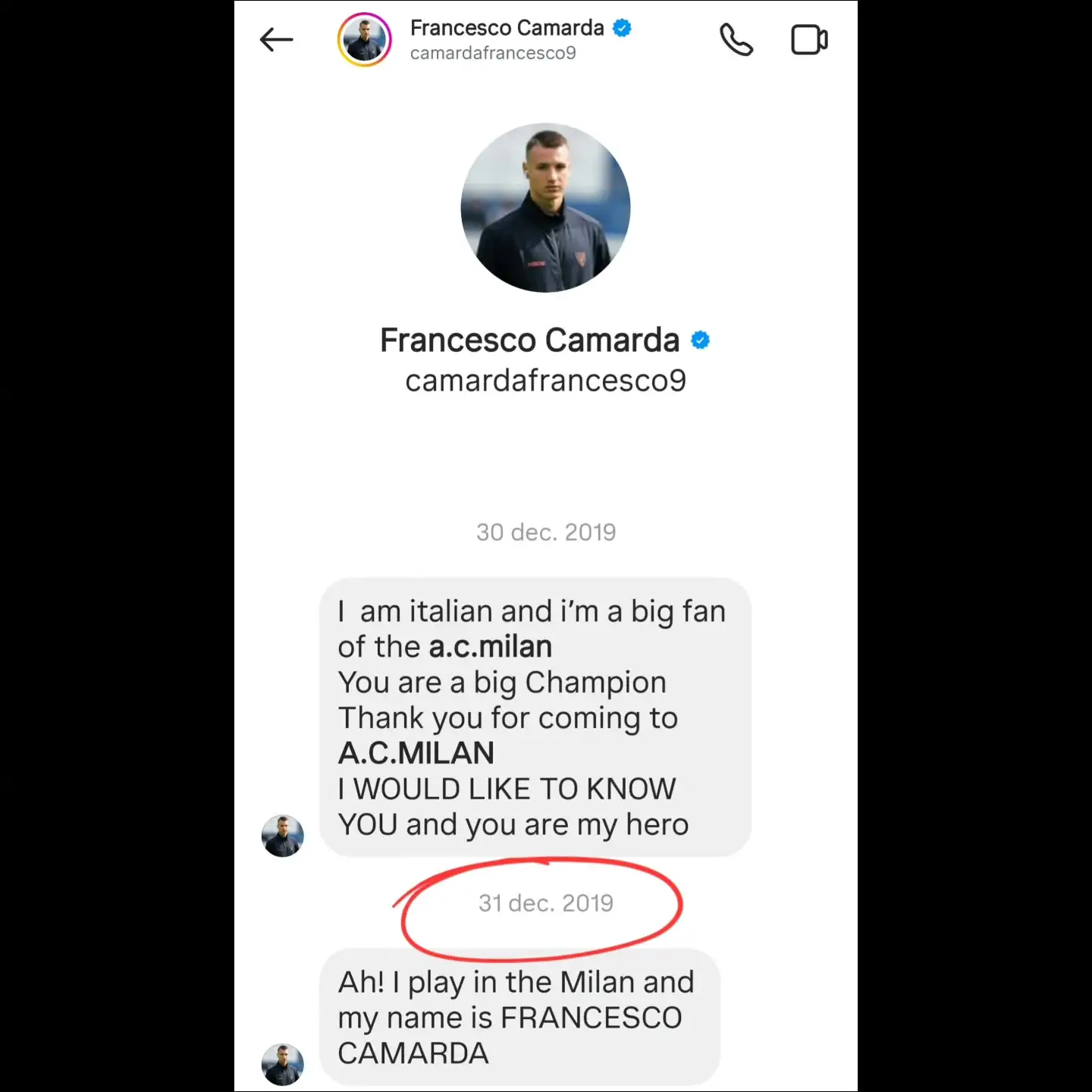 比賽結(jié)束后第二天,伊布更新社媒,曬出一張卡馬爾達在2019年與其的聊天截屏。卡馬爾達在與伊布的聊天中寫道:我是意大利人,我是AC米蘭的頭號球迷。你是一位偉大的冠軍,謝謝你來到AC米蘭。我很想認識你,你是我的英雄。我在AC米蘭踢球,我的名字是弗朗切斯科-卡馬爾達。