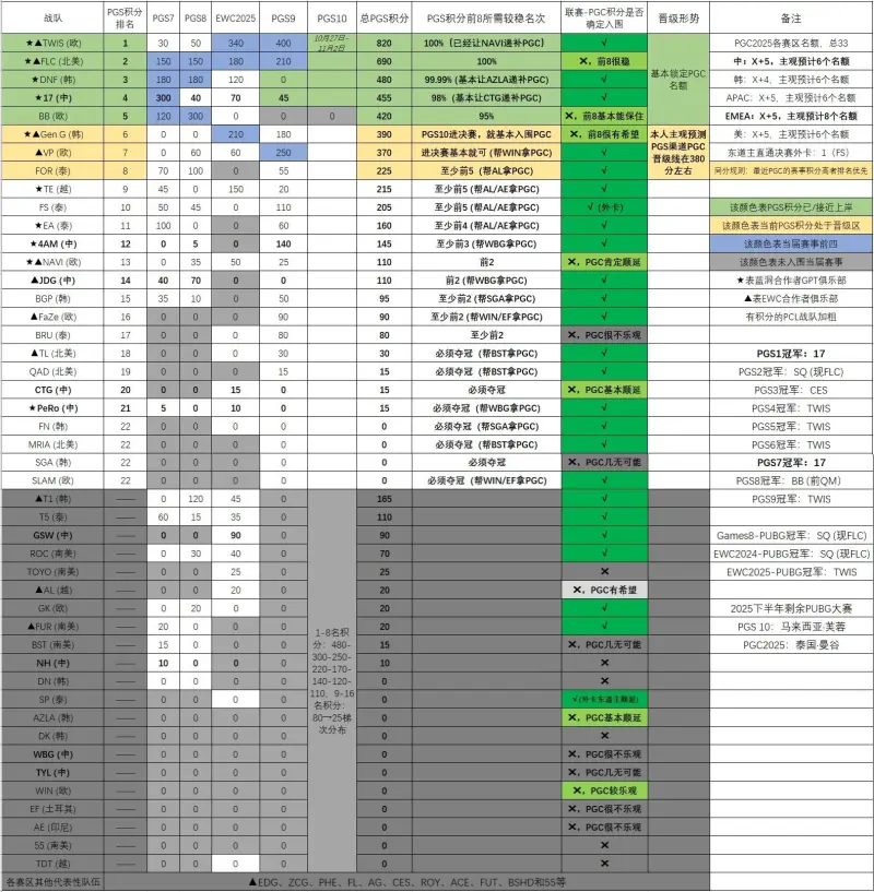 ⑤PGC剩余名額(基本格局):剩余3個(gè)名額,理論上差不多10個(gè)隊(duì)有機(jī)會(huì)爭(zhēng)奪,但后面列出的大部分隊(duì)進(jìn)PGC的概率都太小了。。。