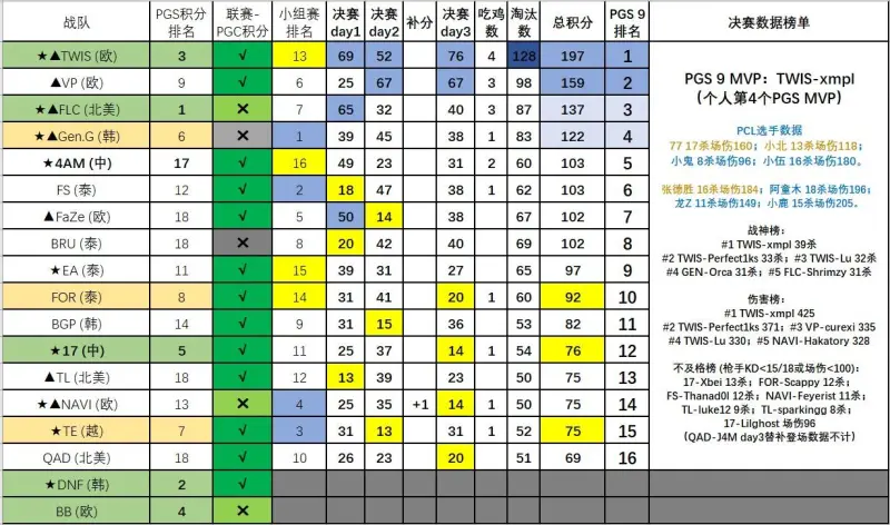 2、PGS 9決賽積分、排名、數(shù)據(jù)榜單等詳情表