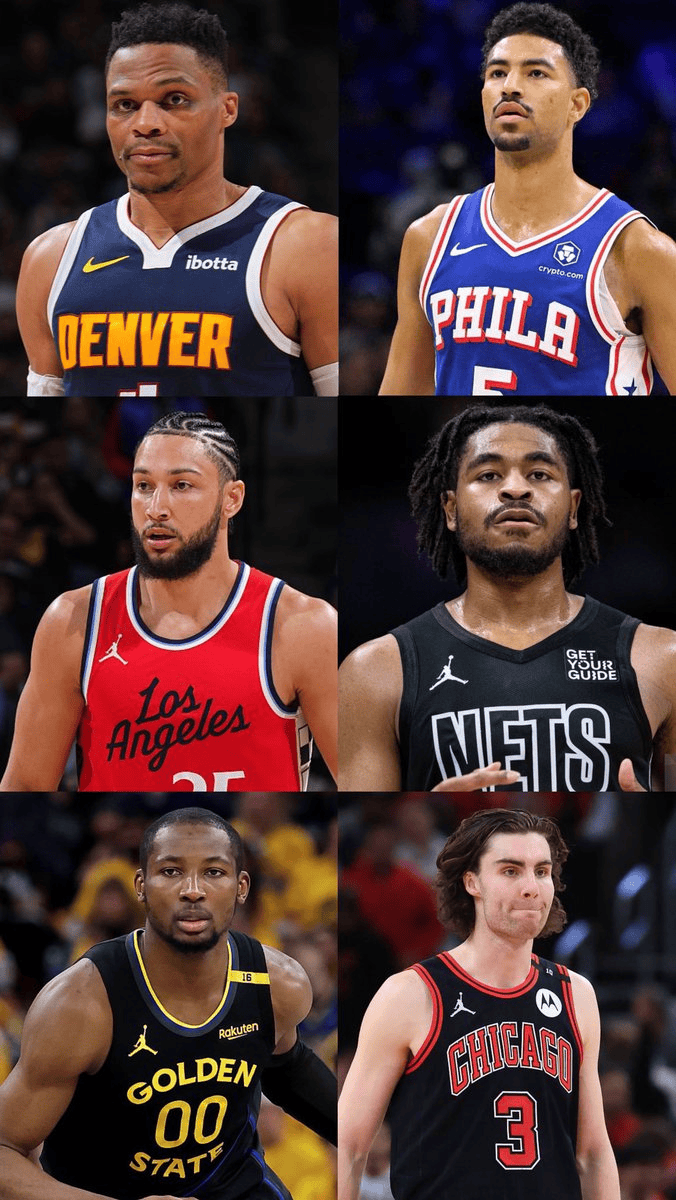 圖中的球員包括:威少、格蘭姆斯、本-西蒙斯、卡姆-托馬斯、庫明加和吉迪。