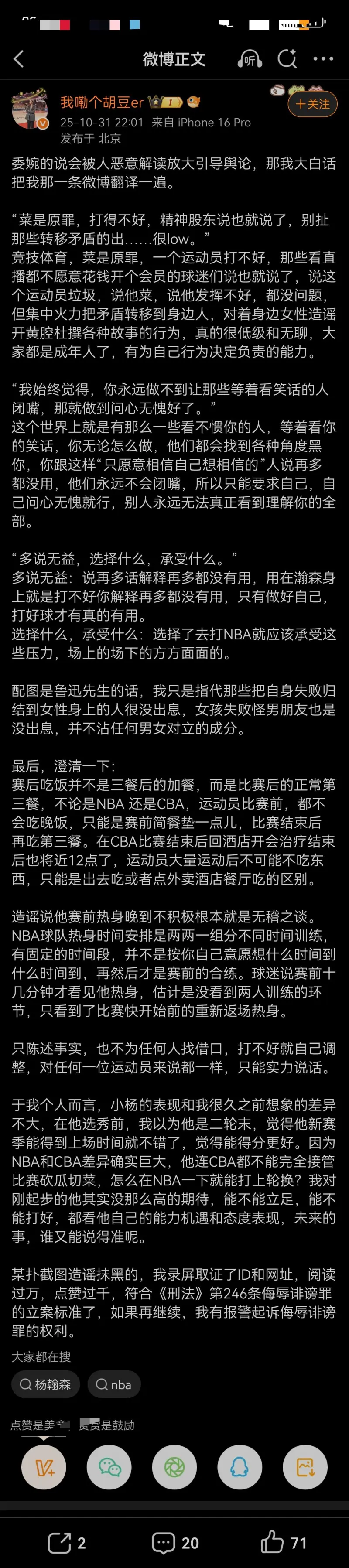 我現(xiàn)在發(fā)現(xiàn)。楊這身邊咋都是這種人啊。我們開始都支持楊,畢竟終于又有一個登錄nba。打的不好也是由于我們的高期待以及夏季球隊共同營造的遐想。虎撲一直有球迷,包括各種平臺,國內(nèi)國外都看到他最近的場外新聞滿天飛,球場表現(xiàn)差開始噴他不盡如人意。結(jié)果就噴到她女朋友上,這女閨蜜坐不住了?先發(fā)一張陰陽,再發(fā)一則解鎖陰陽。我滴媽,這種事干的出是無腦閨蜜還是有心綠茶婊啊。他說的那兩個論點懂個球啊。先借用王仕鵬的一句解釋,接著來一句CBA都沒法砍瓜切菜來這里指定打不好。我去,你咋不開賽前說啊。還有好多網(wǎng)友,他刪除了以前很多的帖子和言論。就這種節(jié)骨眼也不是告訴閨蜜遠離聚光燈,讓楊瀚森沉淀下來,還在這里拱火式社交媒體。是我,我真謝謝這樣的好閨蜜,沒有最蠢只有更蠢,這都不是蠢這是壞了吧。我是小楊,恨不得抽死他女朋友連帶這閨密,打拳就算了。像咱們男人任何一個講義氣的,這種輿情時候都發(fā)不出這種言論,去影響自己好朋友的伴侶吧。現(xiàn)在年輕人的腦回路真極品