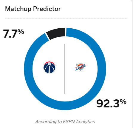 賽前,日雷美媒ESPN對(duì)本場(chǎng)比賽進(jìn)行了預(yù)測(cè),霆v霆?jiǎng)倮做獎(jiǎng)俾矢哌_(dá)92.3%,賽雷奇才勝率僅為7.7%。流言率高