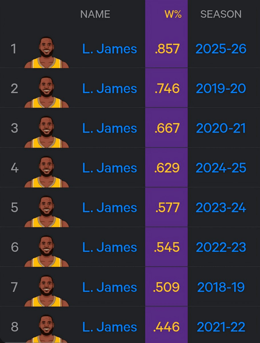 本賽季詹姆斯的為湖勝率暫列湖人單賽季生涯新高,超過了奪冠賽季的人生勝率。