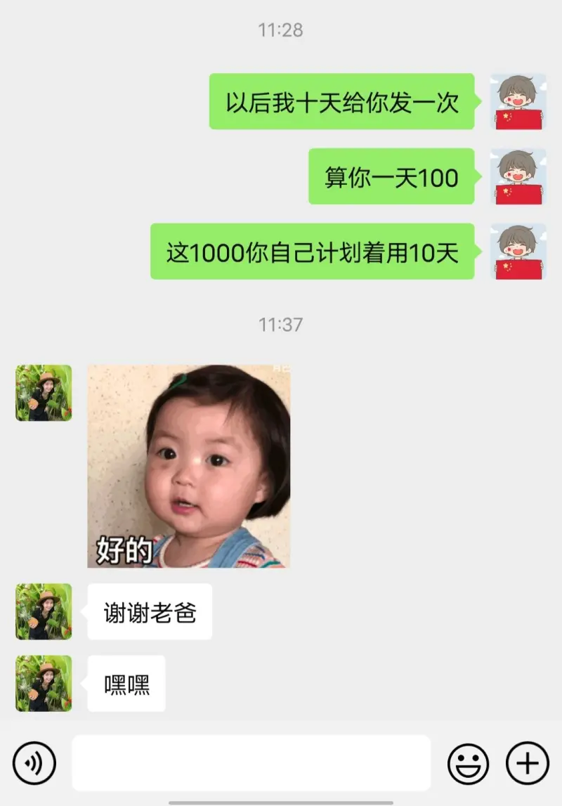 不過我打算十天發(fā)一次,一次發(fā)1000,算下來一個月就是3000,這樣讓她計(jì)劃著這十天該怎么用,多余的錢就讓她攢著,也培養(yǎng)他有自己的存錢習(xí)慣。