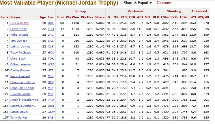 此外,諾維斯基21年生涯中,有12個賽季位列MVP榜單前十五。