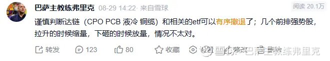2)CPO&PCB&液冷:今天達(dá)鏈?zhǔn)堑帽容^慘的,更慘的是有的人是剛從紅利股切換過(guò)來(lái)的,兩頭挨打;整個(gè)9月份,以易中天勝為首的達(dá)鏈龍頭持倉(cāng)體驗(yàn)都很差,只有7-8月漲幅比較小的股在補(bǔ)漲;實(shí)際上8月29日已經(jīng)給出了逃頂信號(hào),一個(gè)月之后來(lái)驗(yàn)證,依然有效;達(dá)鏈在調(diào)整結(jié)束后,不排除還有走二波的可能;